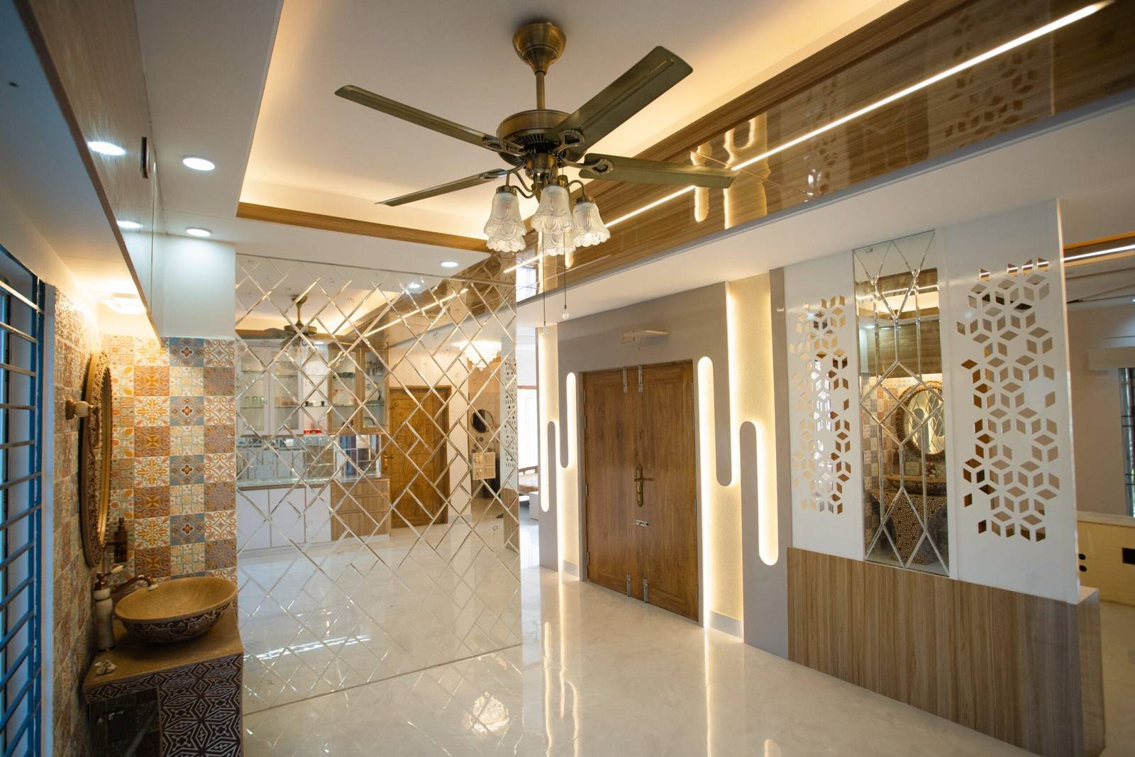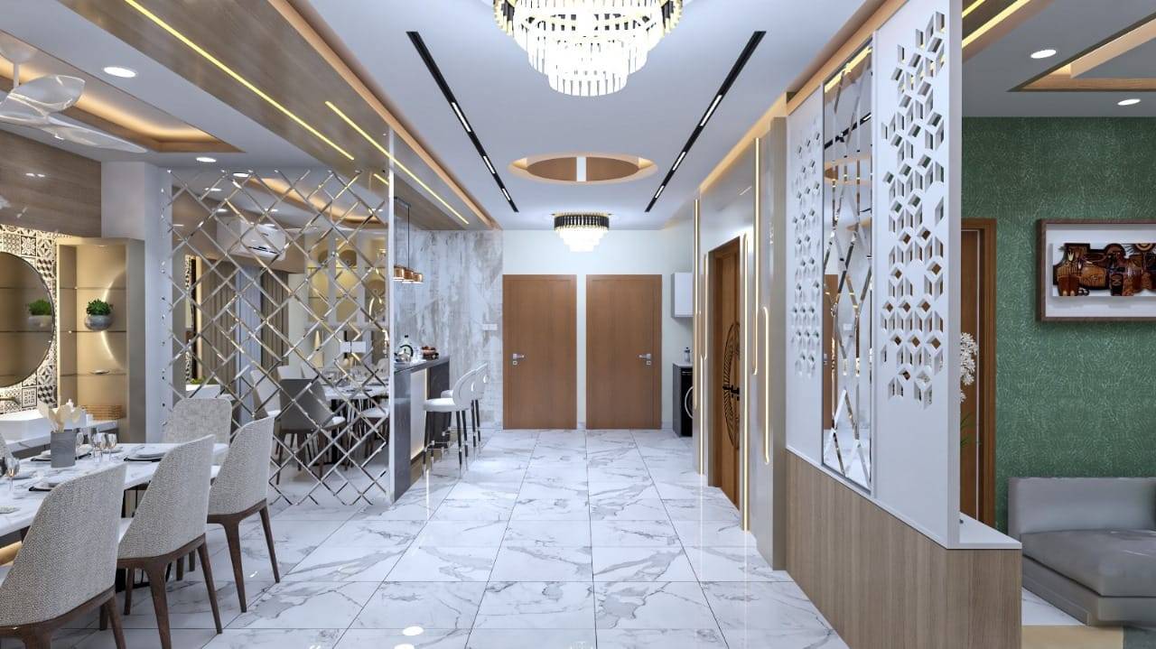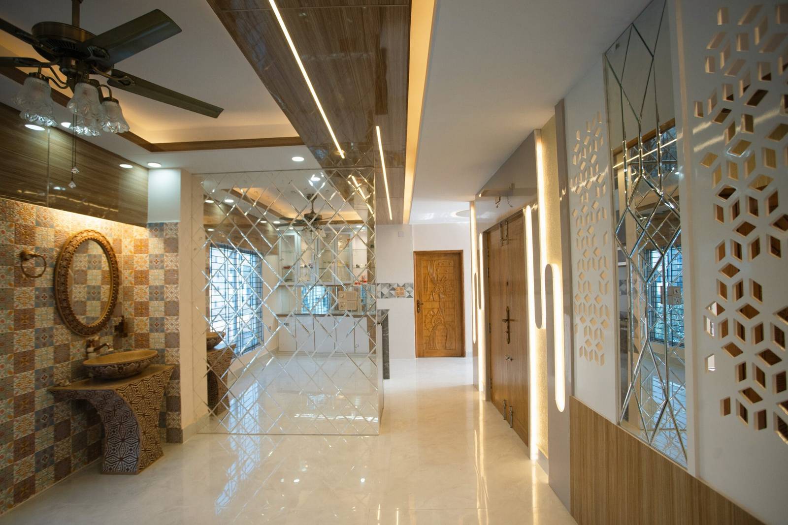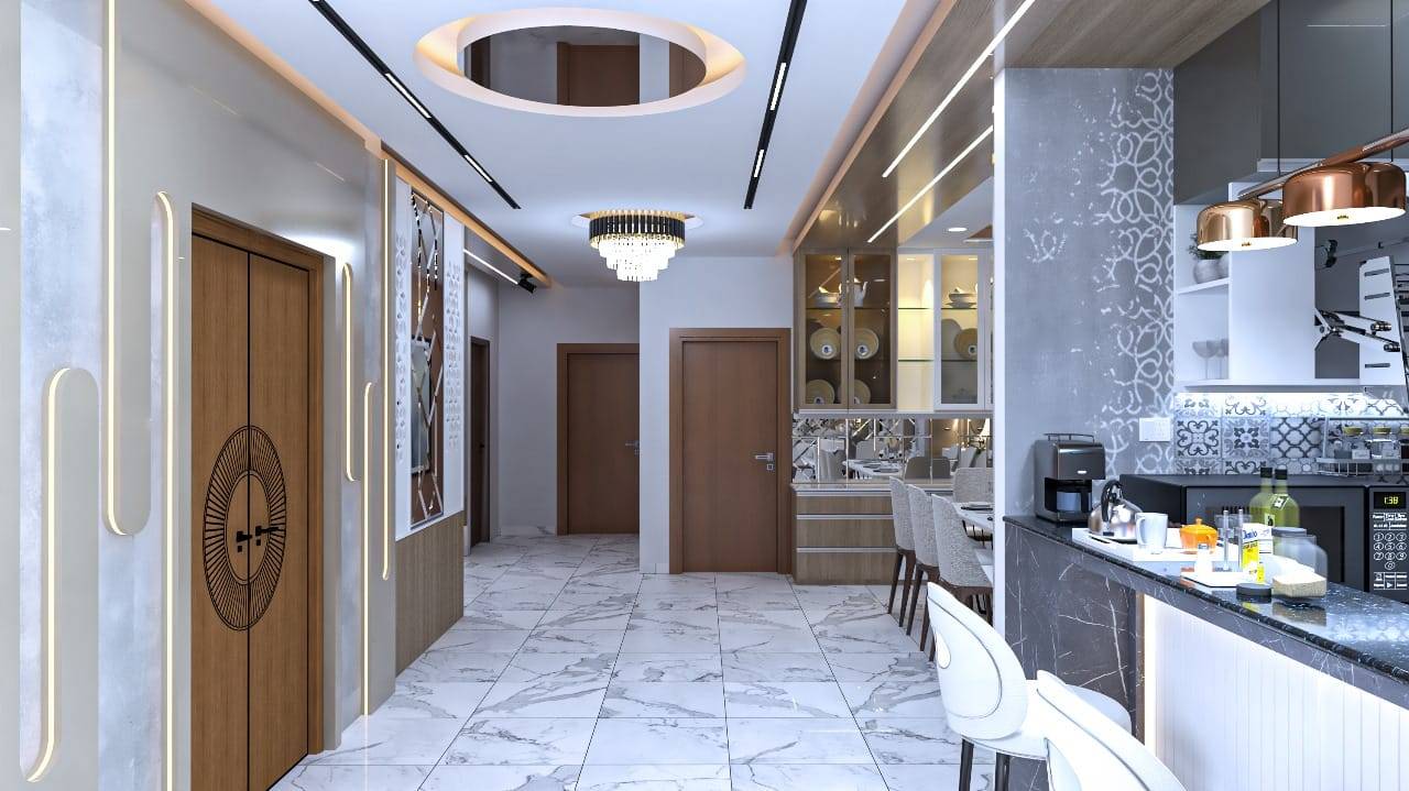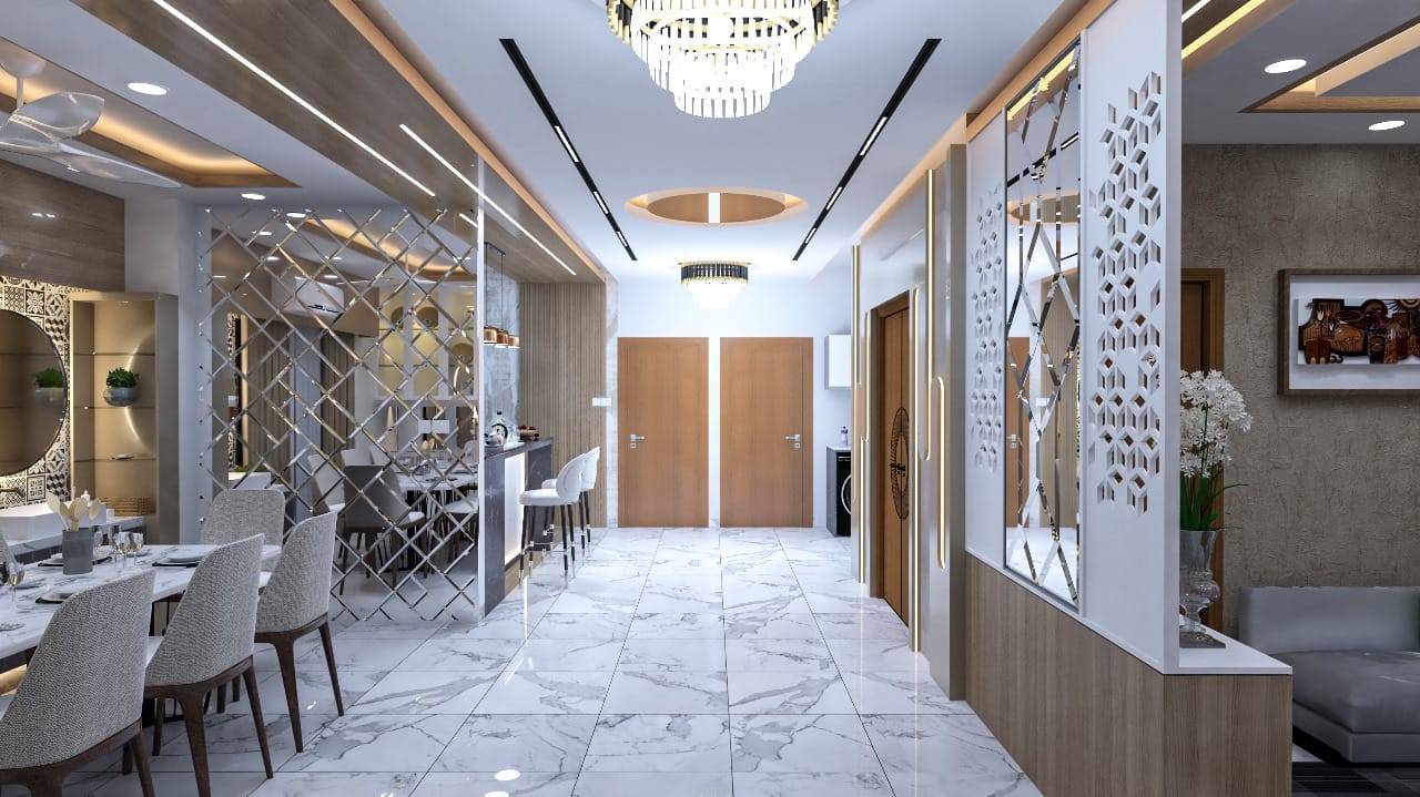 We used a mix of teak wood, brushed metal, and textured wallpapers to add depth and character. Statement lighting fixtures and curated art pieces elevate the ambiance.