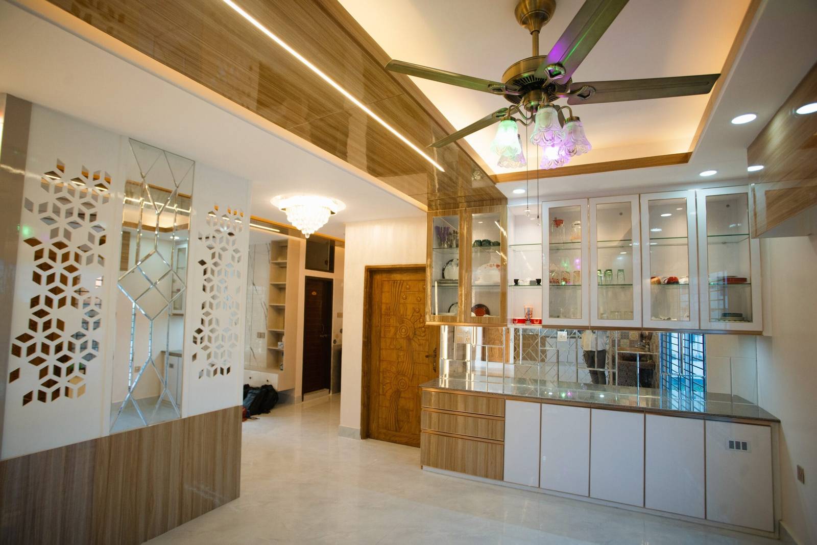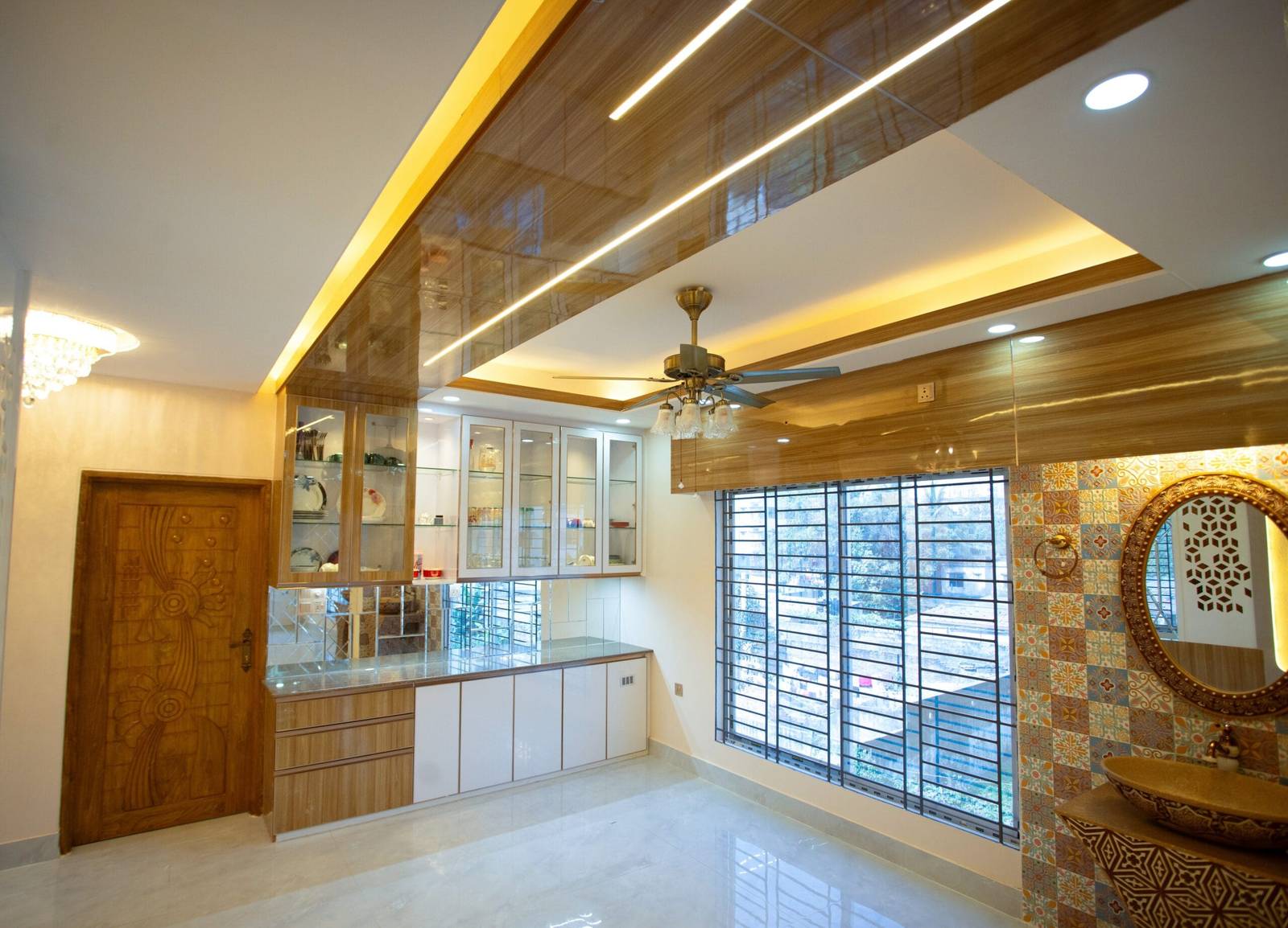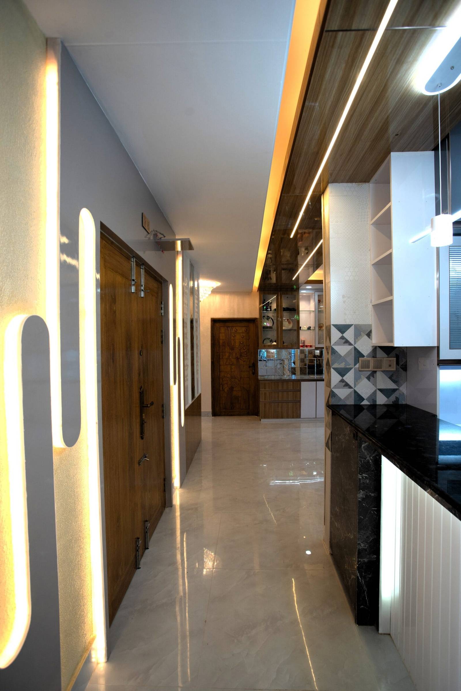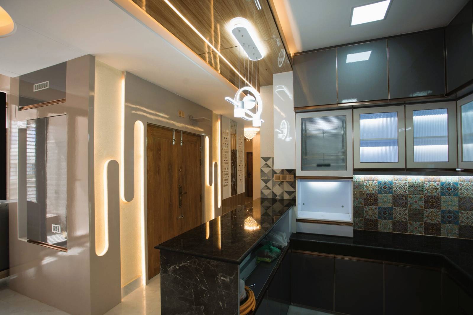 We used a mix of teak wood, brushed metal, and textured wallpapers to add depth and character. Statement lighting fixtures and curated art pieces elevate the ambiance.