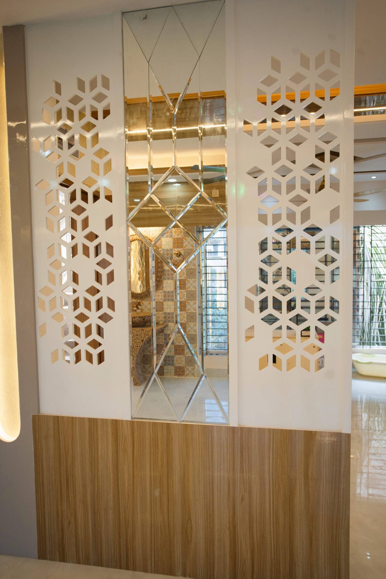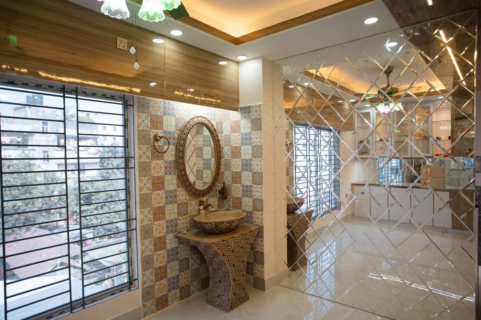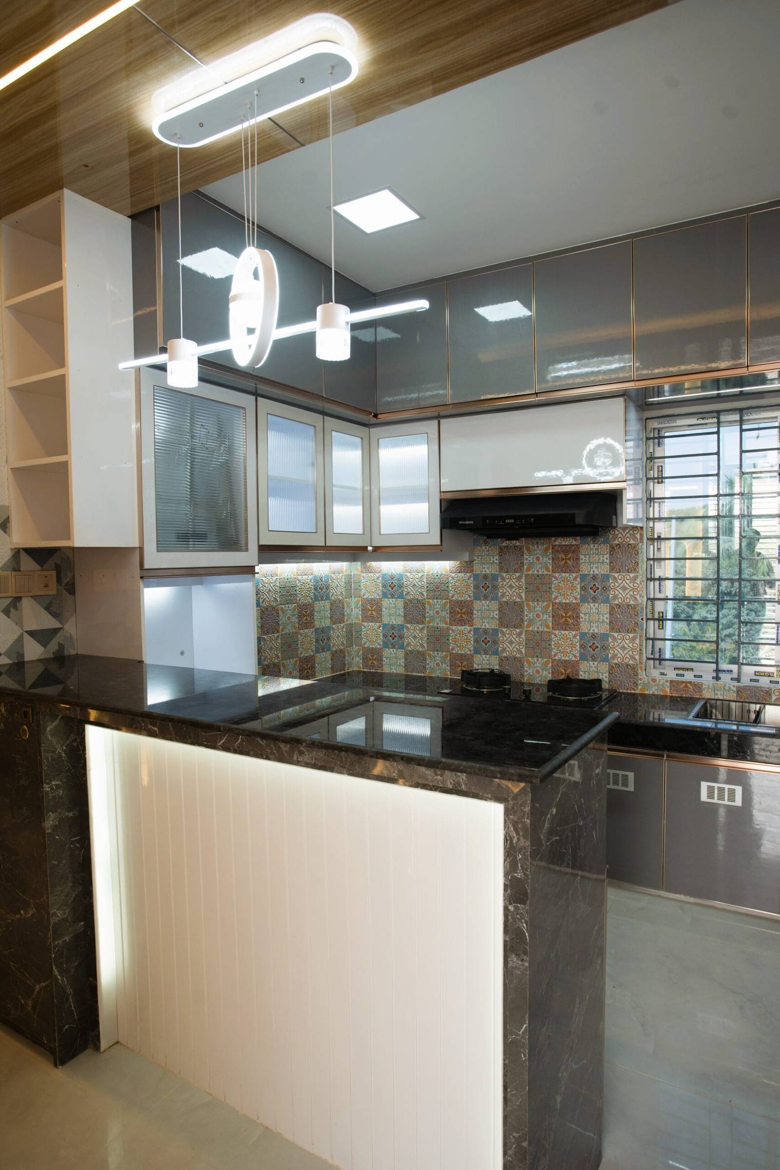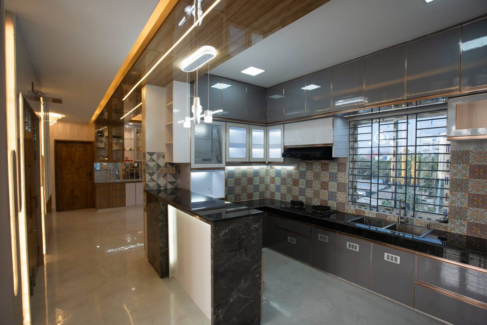We used a mix of teak wood, brushed metal, and textured wallpapers to add depth and character. Statement lighting fixtures and curated art pieces elevate the ambiance.