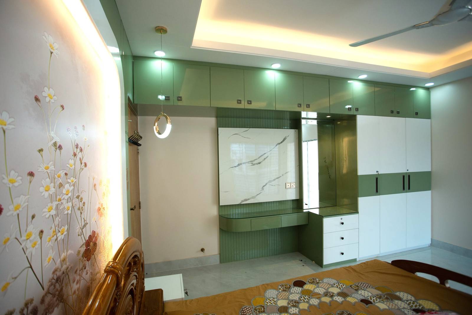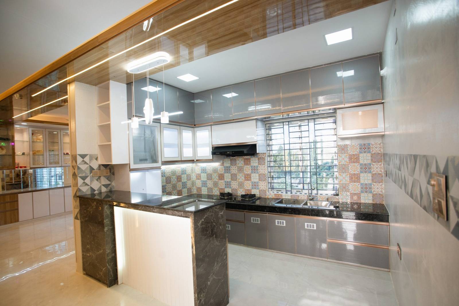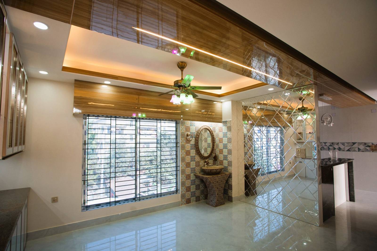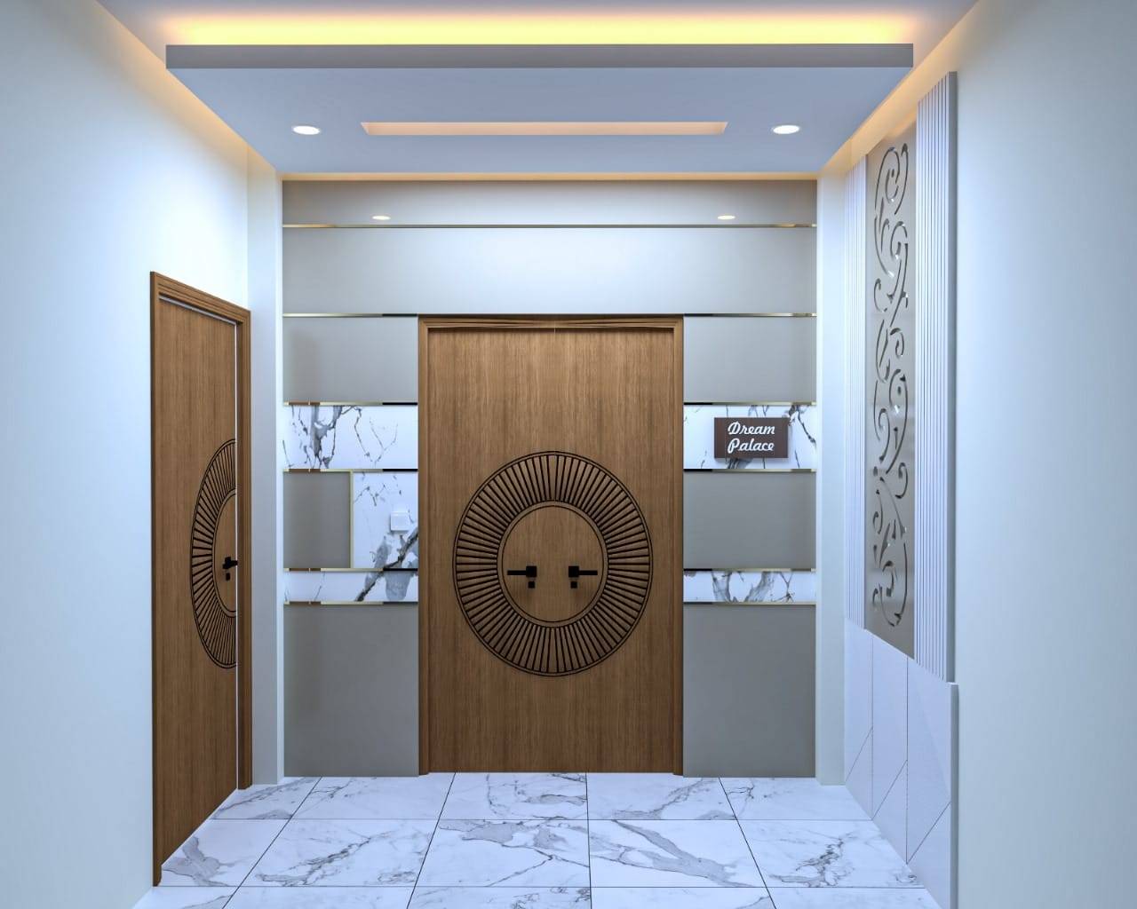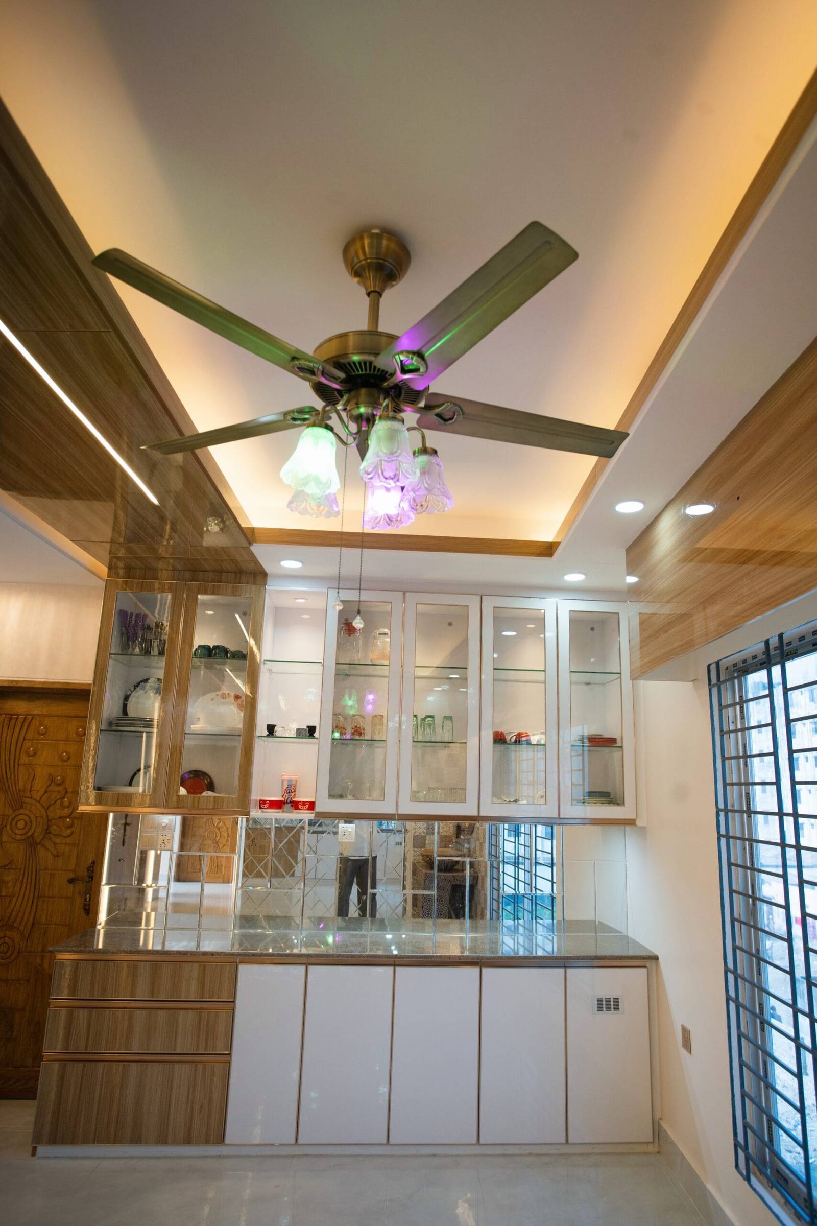 We used a mix of teak wood, brushed metal, and textured wallpapers to add depth and character. Statement lighting fixtures and curated art pieces elevate the ambiance.