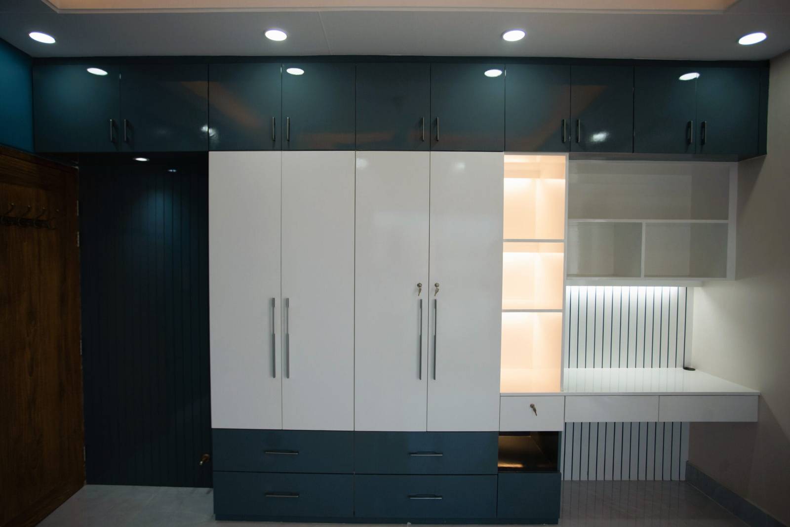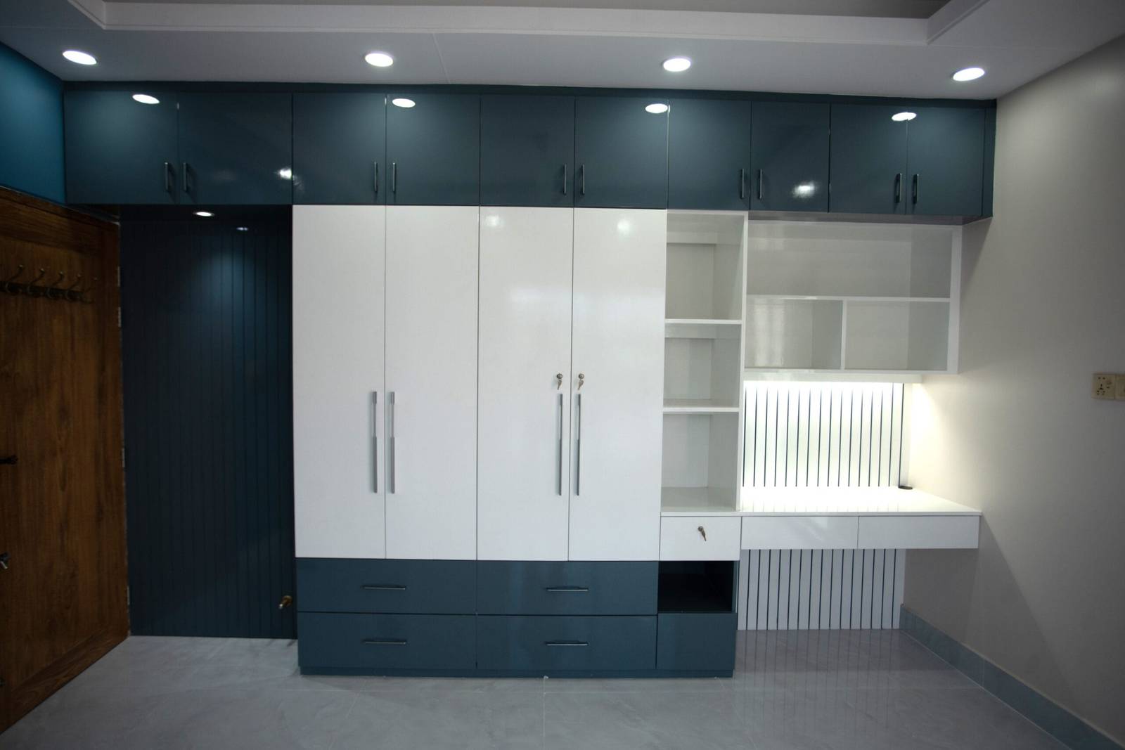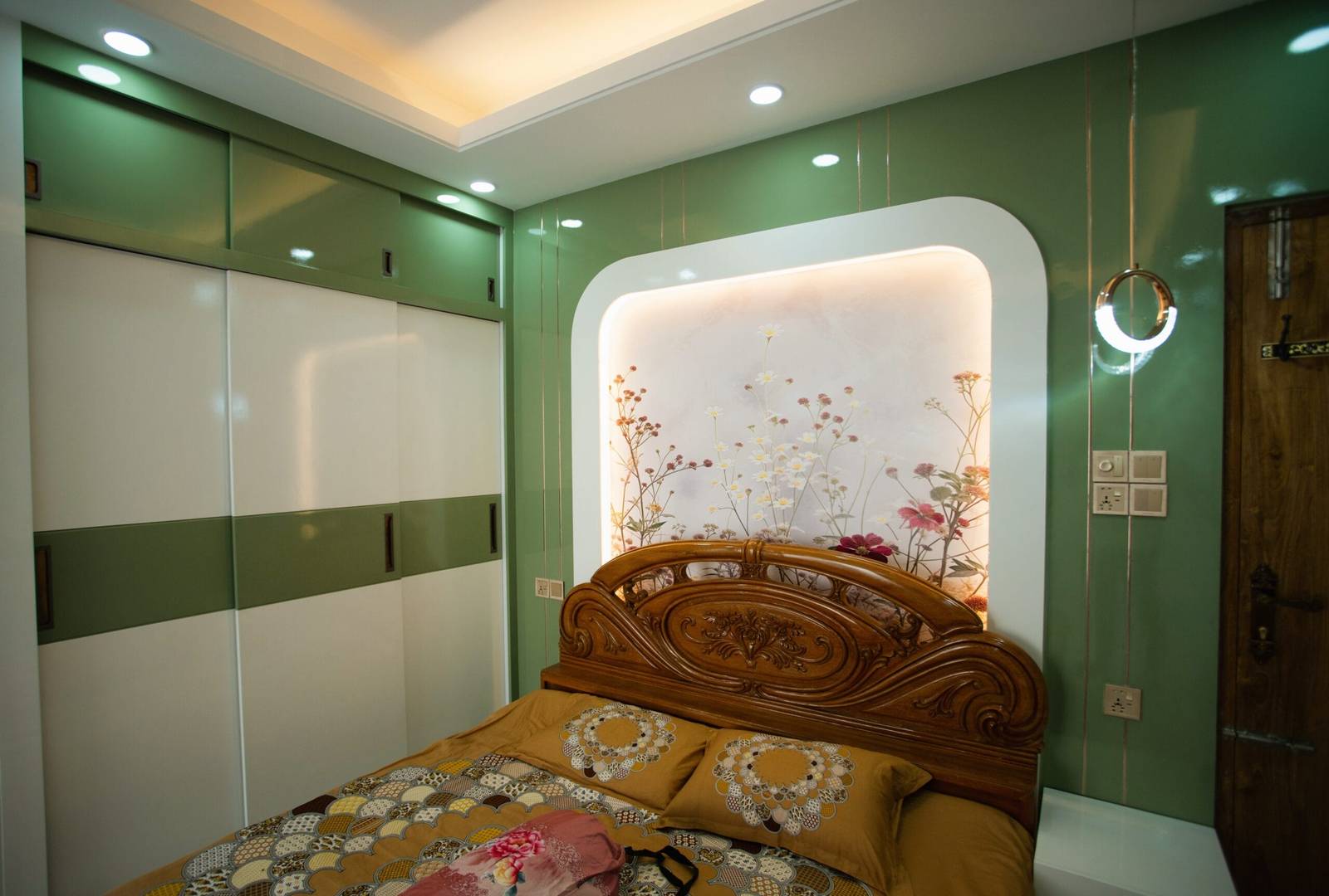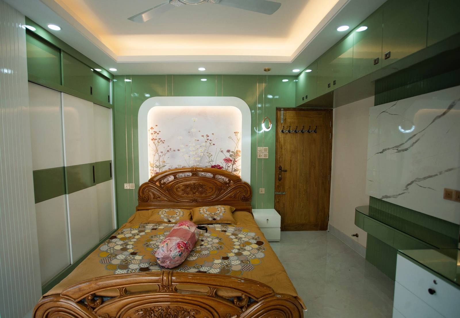 We used a mix of teak wood, brushed metal, and textured wallpapers to add depth and character. Statement lighting fixtures and curated art pieces elevate the ambiance.