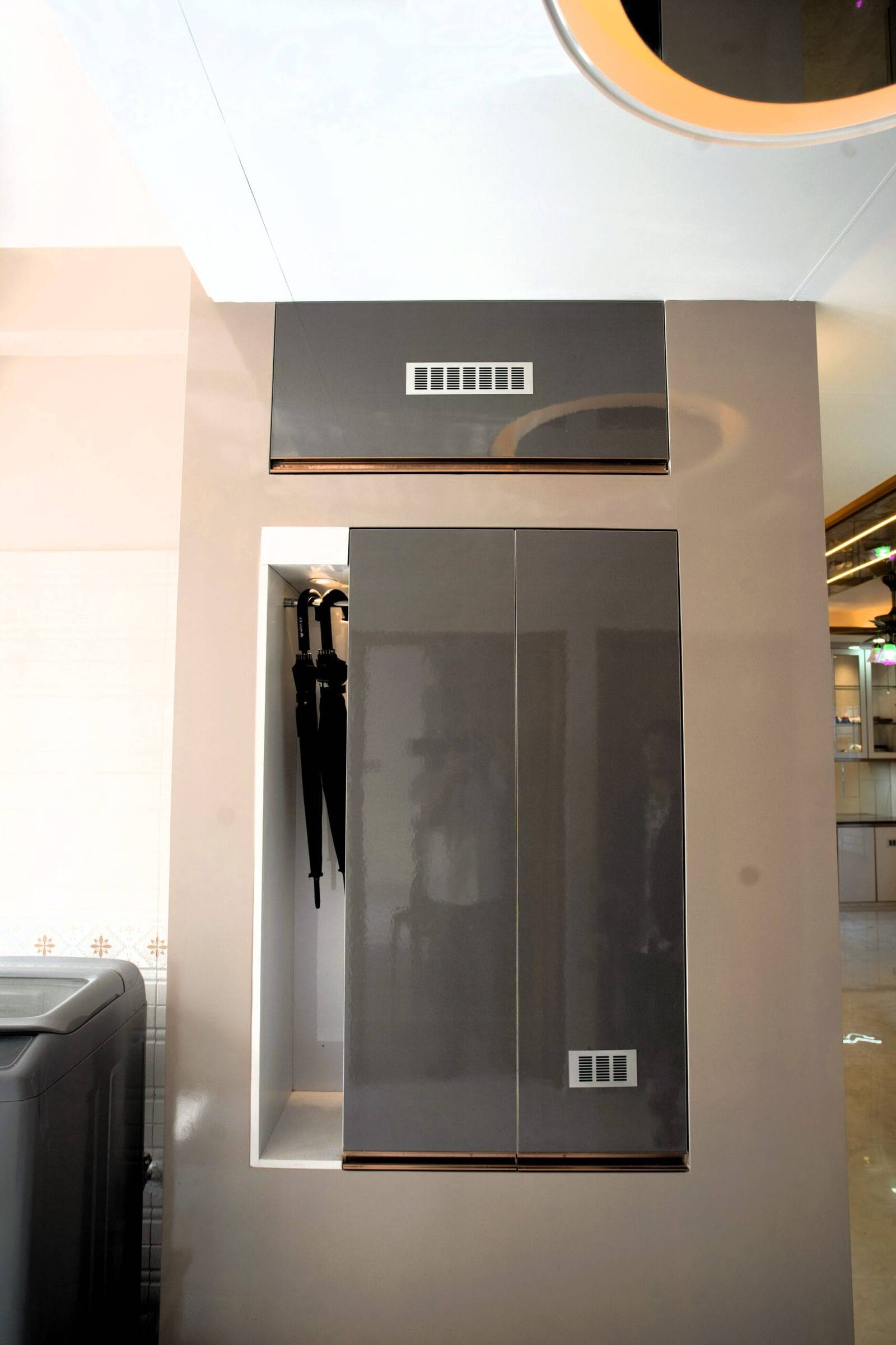 - Storage: Built-in cabinetry under the stairs and wall-mounted units maximize usable space.