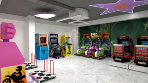 - Cartoon-themed archway and welcome desk