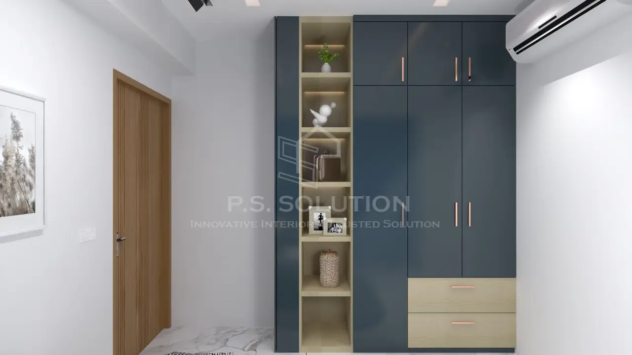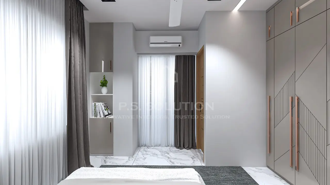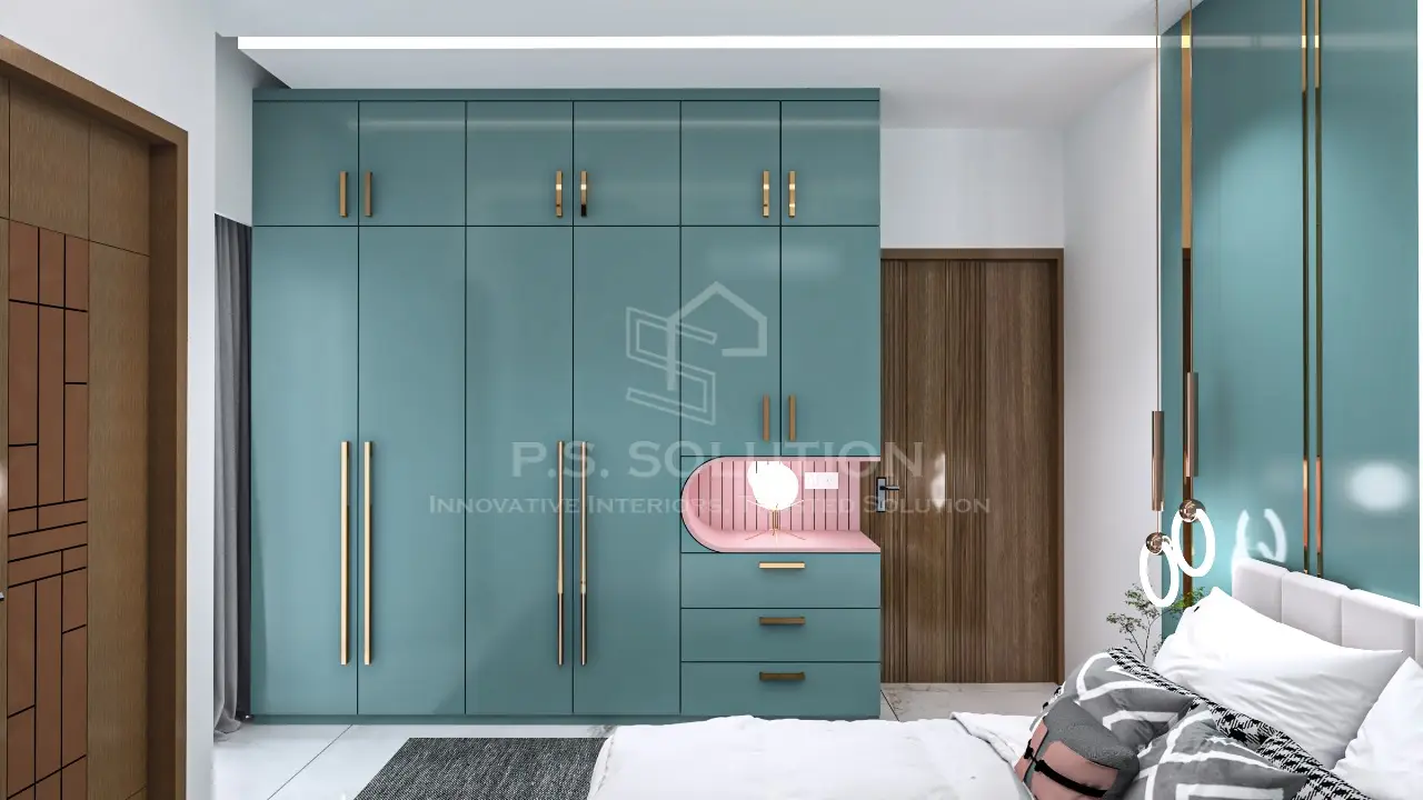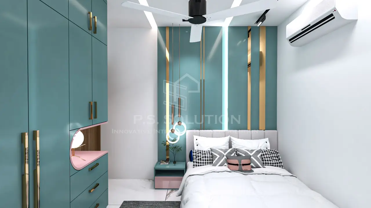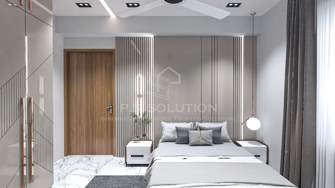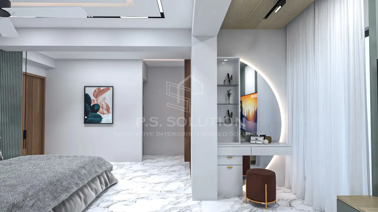 • Master Bedroom: A cozy retreat with warm lighting, layered textures, and custom-built furniture using Gorjon plyboard.