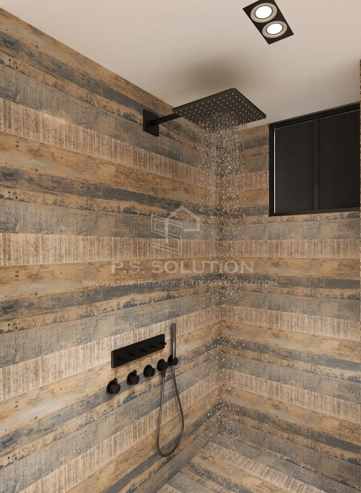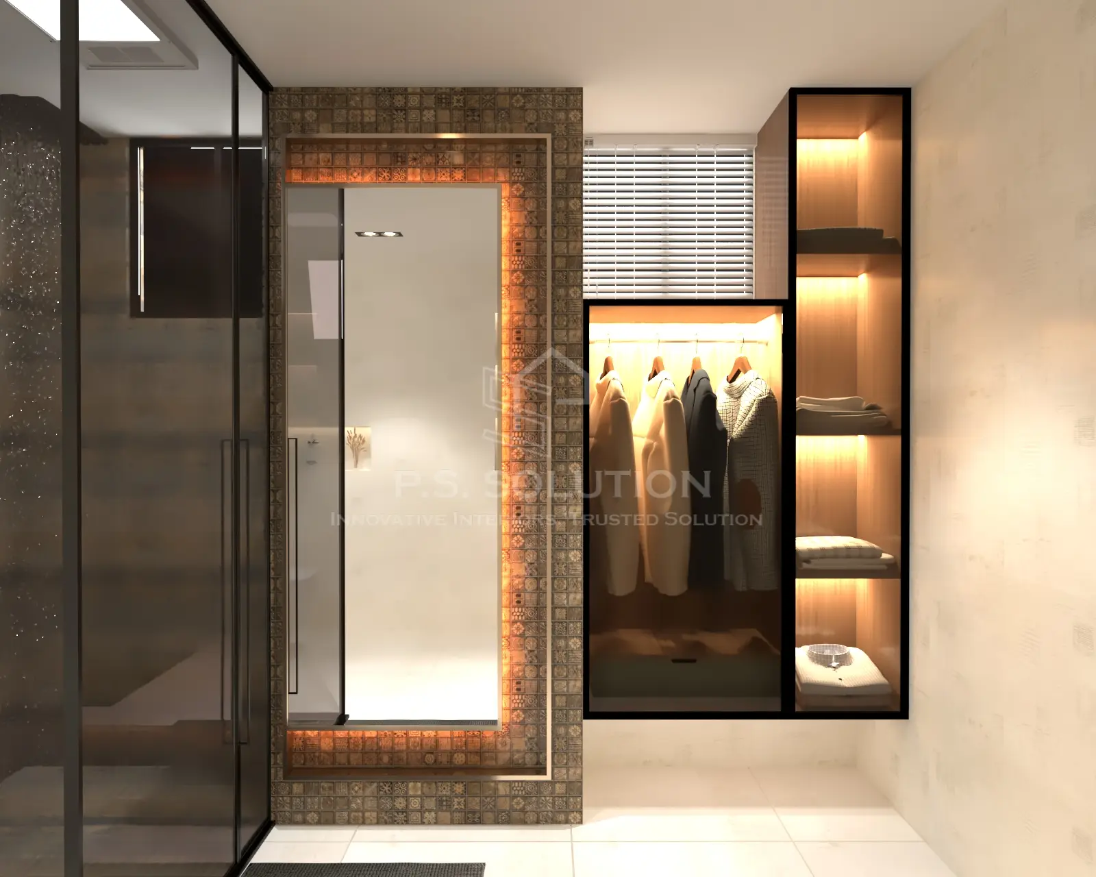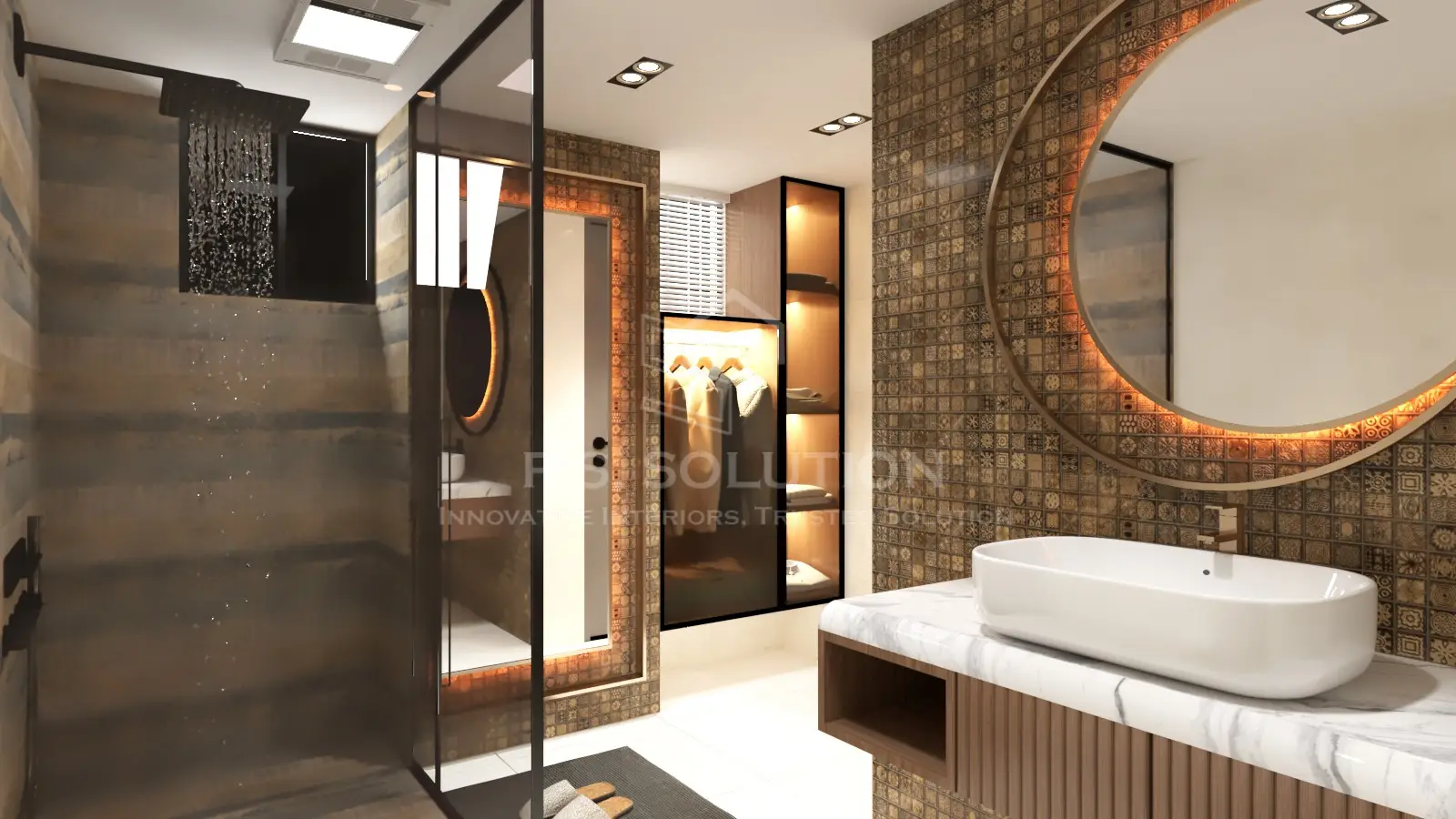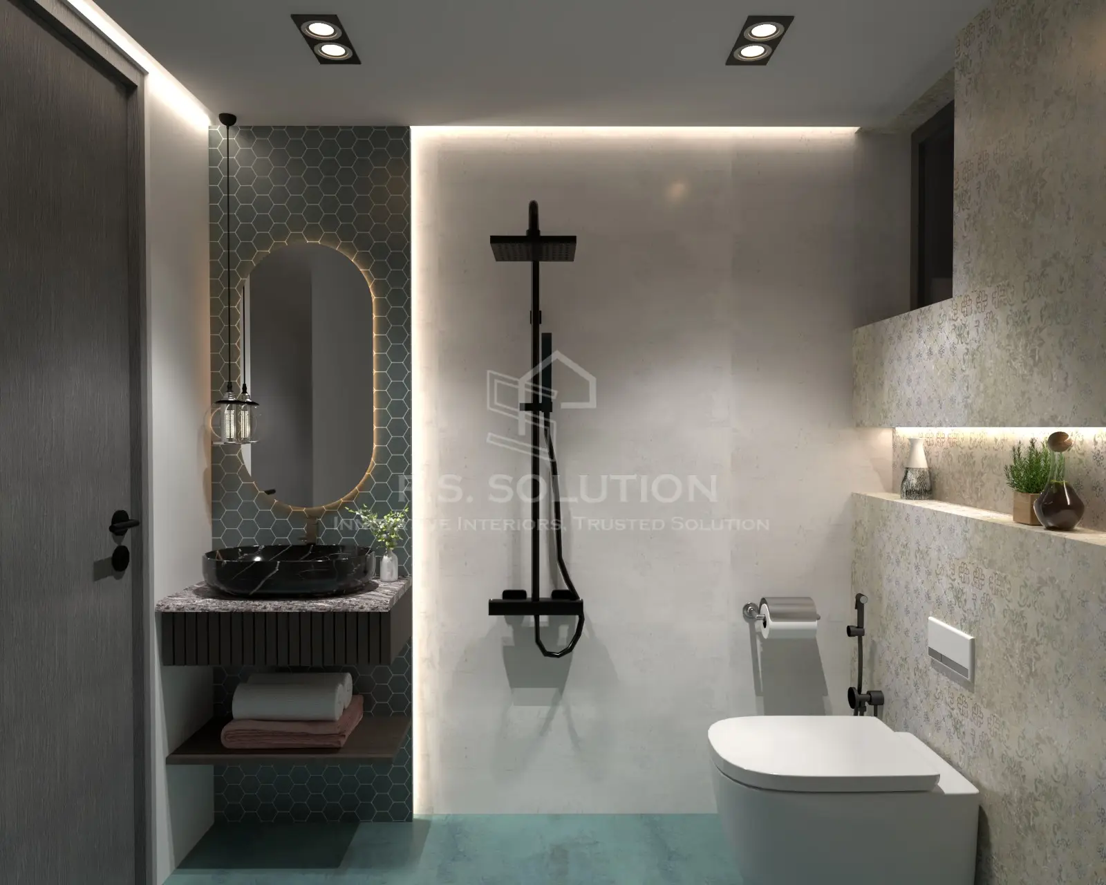 • Modern Bathroom: A spa-inspired sanctuary featuring matte black fixtures, a floating vanity with under-cabinet lighting, and a frameless glass shower enclosure. The walls are clad in large-format porcelain tiles for a sleek, seamless look, while a backlit mirror adds a touch of luxury.