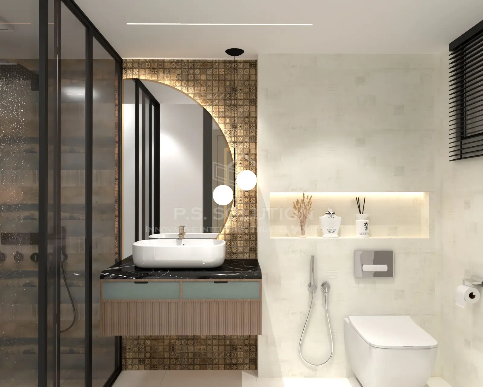• Porcelain Tiles: Used in the bathroom for their durability and contemporary appeal.