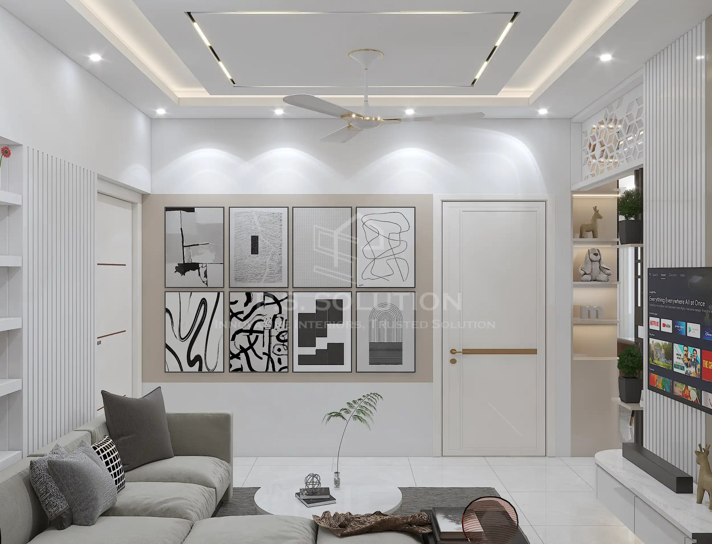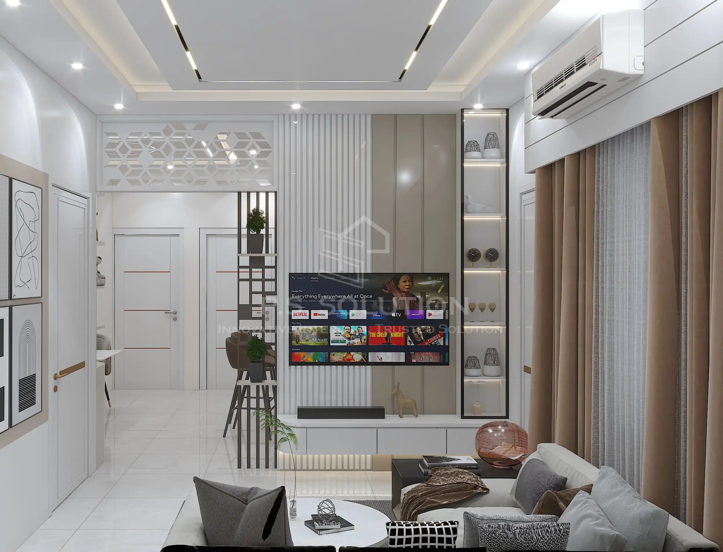 - Living Room: A spacious layout with modular seating, textured walls, and ambient lighting. The use of soft greys and warm wood tones created a cozy yet sophisticated vibe.